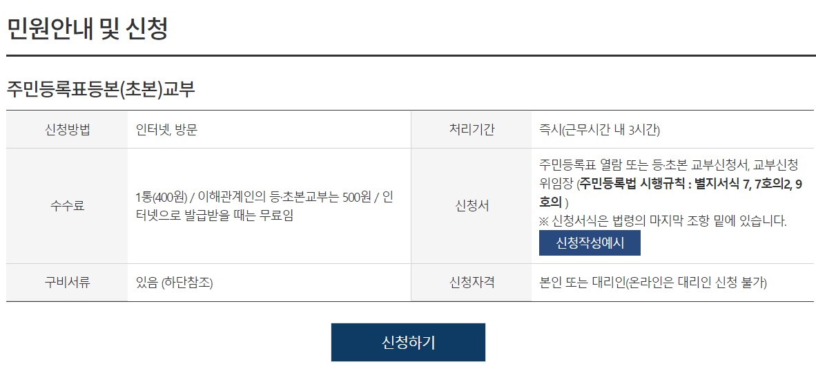 정부 24 민원 홈페이지로 접속을 하면 민원안내 및 신청하기가 나오는데요. 신청방법에 보면 인터넷이 명시되어 있죠. 인터넷 신청이기 때문에 처리기간은 바로 처리가 되어 프린트할 수 있어요. 매우 간편하죠. 수수료는 400원이지만 인터넷으로 발급하면 무료라는 점.