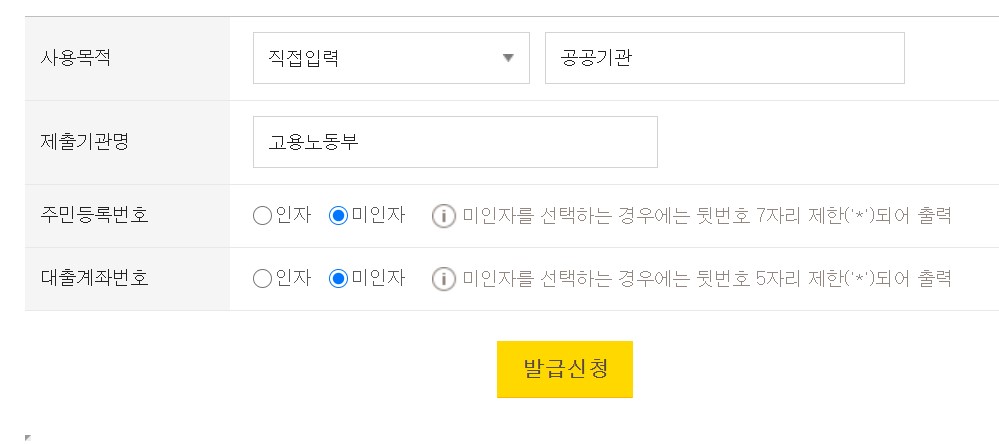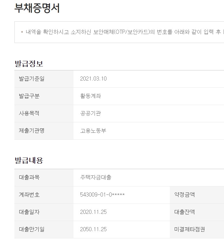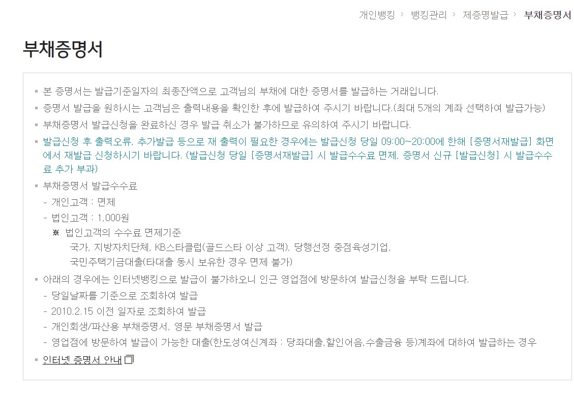 이제 발급받을 준비는 끝났어요. 타 은행기관 같은 경우는 부채증명서 발급 비용이 있는지