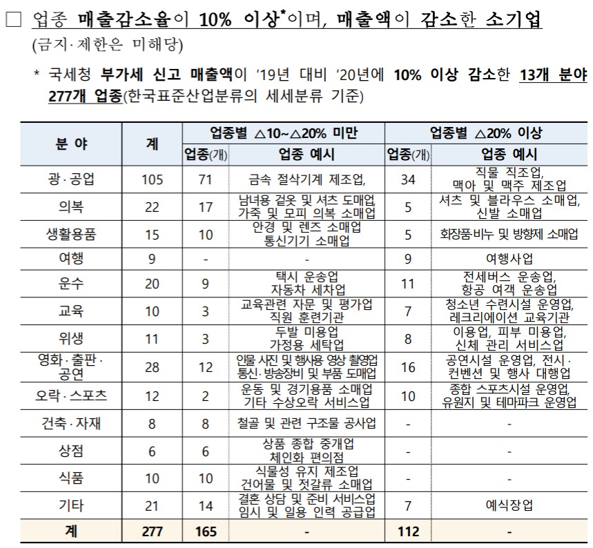 2) 국세청 부가가치세 신고 매출액이 19년도에 비해 20년도에 와서 10% 이상 감소한 업종