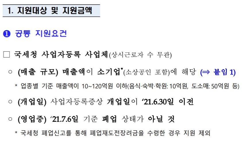 2021. 6. 30. 이전에 개업을 한 소상공인이고 7월 6일 기준 폐업상태가 아닌 국세청에 사업등록을 한 소상공인이 대상으로 지원대상이 됩니다.