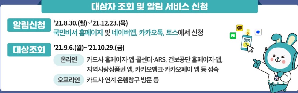 2) 오프라인 : 본인이 사용하는 카드사 연계 은행 창구 방문하여 대상자 조회가 가능합니다.