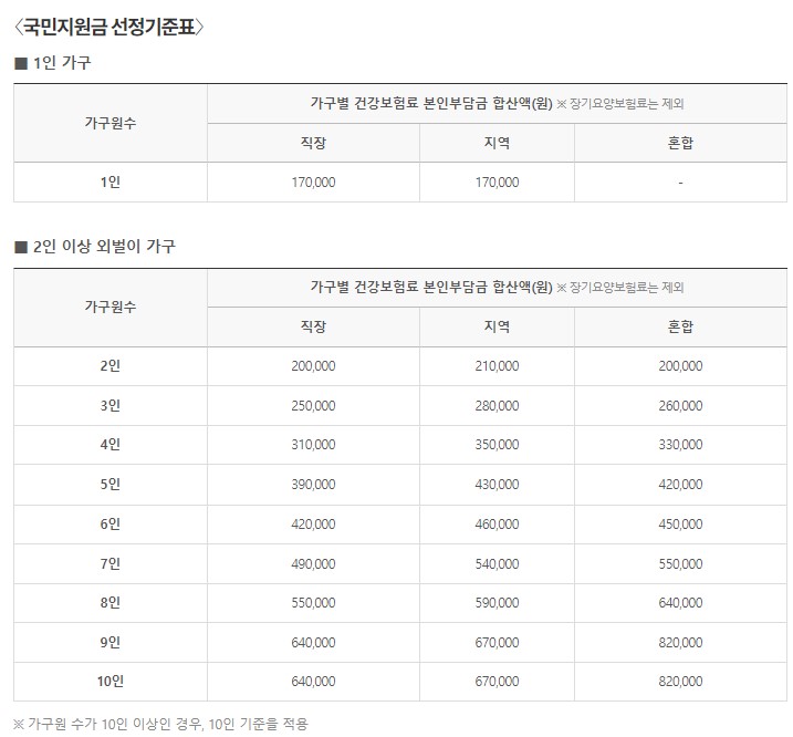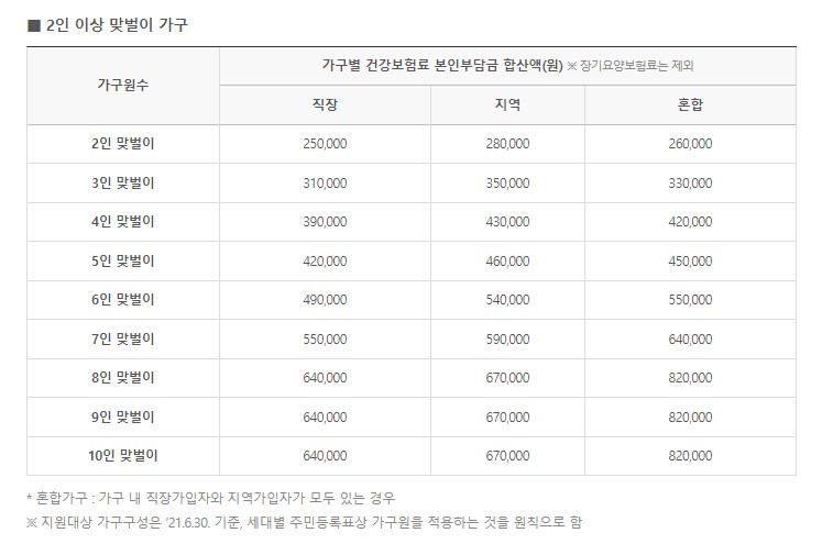 국민지원금 선정기준표에서 가구별 건강보험료를 통하여 선정기준을 정하는 데요. 1인 가구 / 2인 이상 외벌이 가구 / 2인 이상 맞벌이 가구 (*가구원 수가 10인 이상인 경우, 10인 기준을 적용)