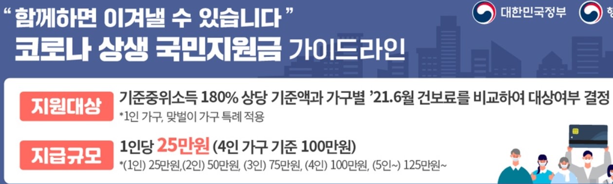 정부는 코로나19 거리두기가 장기화되고 있는 시점인 이번 달 코로나 상생 국민지원금 신청을 9월 6일부터 신청을 시작하기로 하였습니다. 정부의 5번째인 이번 5차 재난지원금은 코로나 19 피해지원을 위해 1인당 25만 원을 국민 지원금 선정기준표에 따라 지급을 합니다. 5차 재난지원금인 코로나 상생 국민지원금 온라인 대상자 조회 및 대상자 신청방법 / 오프라인 신청방법 및 일정을 알려드리도록 하겠습니다.