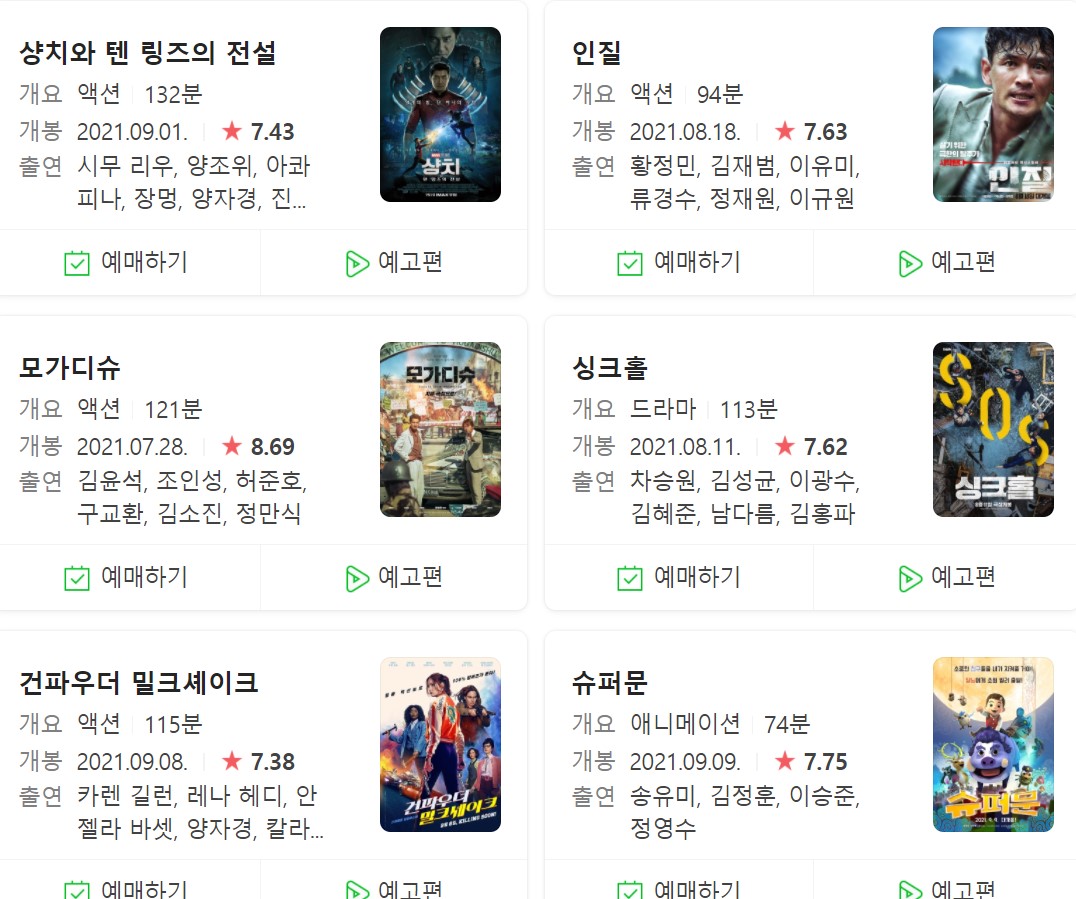 이번 여름에는 공포영화 낭종을 시작으로 300만 관객을 돌파한 2021년 최고의 흥행작 '모가디슈' 황정민 배우의 열연이 빛난 '인질' , 한국형 재난 영화 '싱크홀'까지 연달아 히트하며 오랜만에 극장가에 단비 같은 기간이었습니다. 9월에는 절찬리에 상영 중인 마블의 신작 '샹치와 텐 링즈의 전설'이 흥행을 하고 있고요.