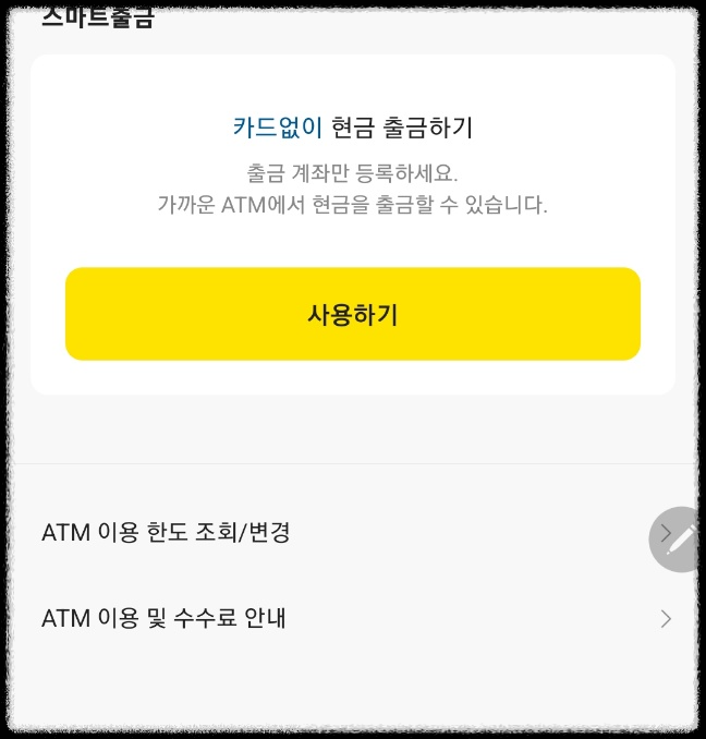 카카오뱅크 체크카드를 이용하여 그동안 atm 머신을 사용하고 있었는데요. 카카오 스마트출금 이라는 서비스를 이용하면 체크카드 없이도 현금 출금 서비스를 이용할 수 있습니다. 오늘은 카카오 ATM 스마트출금 서비스 이용방법 알아보겠습니다.