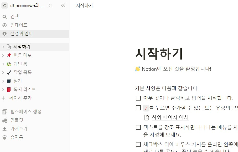 5. 이제 시작하기로 들어왔습니다. 노션 가입완료 (영어로 나온다면 '설정과 멤버 >> 언어와 연결' 에서 변경 가능)