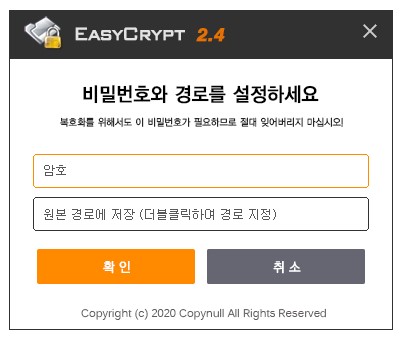 3) 이제 암호화 진행 할 파일에 비밀번호 & 경로를 지정한 후 확인을 누릅니다.
