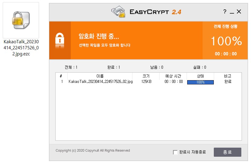 4) 암호화를 원하는 파일이 ezc 생성 되어 작업이 완료되었습니다.