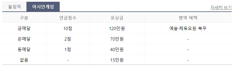 아시안게임에서 메달을 획득하는 경우 얼마의 연금을 받을 수 있는지 알아보았는데요. 금메달 - 120만원/ 연금점수 10점 / 은메달 70만원/ 연금점수 2점 , 동메달 40만원 / 연금점수 1점 을 획득하게 됩니다. 남자선수들은 병역혜택을 받기위해서는 금메달을 획득하여야 예술,체육요원으로 복무가 가능합니다.