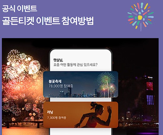 공식 홈페이지에서 골든티켓 이벤트 버튼을 클릭하고 간편 가입 후 이벤트 참가를 할 수 있습니다. 간편하게 이벤트 참가를 하면 불꽃 명당에서 관람이 가능하다는 사실! 골든티켓 좌석은 불꽃이 터지는 바지선과 무대가 정면으로 보이는 명당 중에 명당입니다.