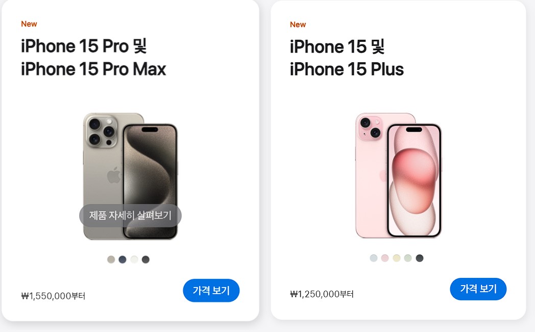 애플 공식 오피셜 홈페이지에서 아이폰15 , 플러서, 프로, 프로맥스 사전예약 신청이 가능합니다. 이번 아이폰15 시리즈는 아이폰 14와 마찬가지로 총 4개 모델 /용량/ 색상 으로 출시되었는데요. 애플 공식 홈페이지 기준 아이폰15 모델 가격은 다음과 같습니다. 새로운 색상은 핑크, 옐로, 그린, 블루, 블랙 4가지 새로운 색상으로 출시됩니다.