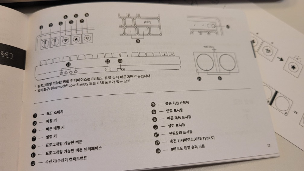 직구버전이지만 다양한 언어의 메뉴얼로 구성되어있구 무려 '한글' 도 제공하고 있어 매우 친절합니다. 키보드가 벌써 집에 3개 이상 쌓여가는데 너무 이쁘게 나와서 구매를 하고 말았네요 ㅋ 실물도 잘 나와서 만약 기계식 무선 키보드를 구매 생각한다면 추천드립니다.