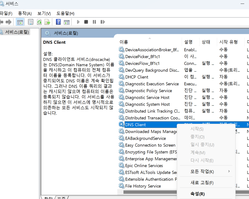 windows를 실행 중인 경우 DNS 도메인 이름을 확인하고 캐시하는 DNS 클라이언트 서비스를 다시 시작해 볼수 있는데요.