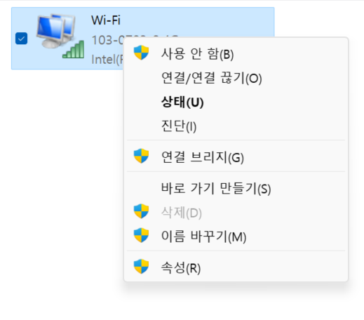 3) 현재 연결을 마우스 오른쪽 버튼으로 클릭하고 연결 방식에 따라 로컬 영역 연결 또는 무선 네트워크 연결이 됩니다. 다음 '속성'을 클릭하세요.