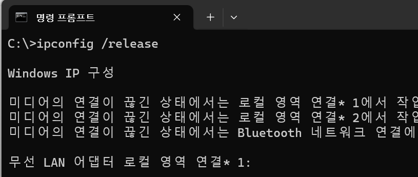 3)명령 프롬프트 창에 'ipconfig / release' 치고 엔터치세요. 이렇게 하면 현재 IP주소가 해제됩니다.