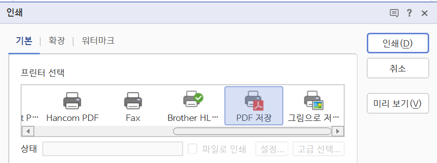 4) 인쇄 버튼을 누르면 프린터 선택 화면이 나옵니다. 거기서 PDF 저장 버튼을 선택 후 인쇄 버튼을 눌러주세요.