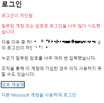 저같은 경우는 누군가 제 이메일로 계정 접속을 시도하며 잘못된 암호를 여러번 넣었는지 로그인이 차단된 상태였는데요. 바로 암호 재설정을 해보았습니다. 하지만 오늘 너무많은 암호 재설정을 시도한 경우 시간이 지나야 재설정이 가능합니다.